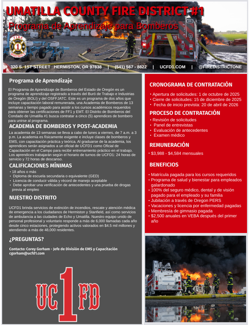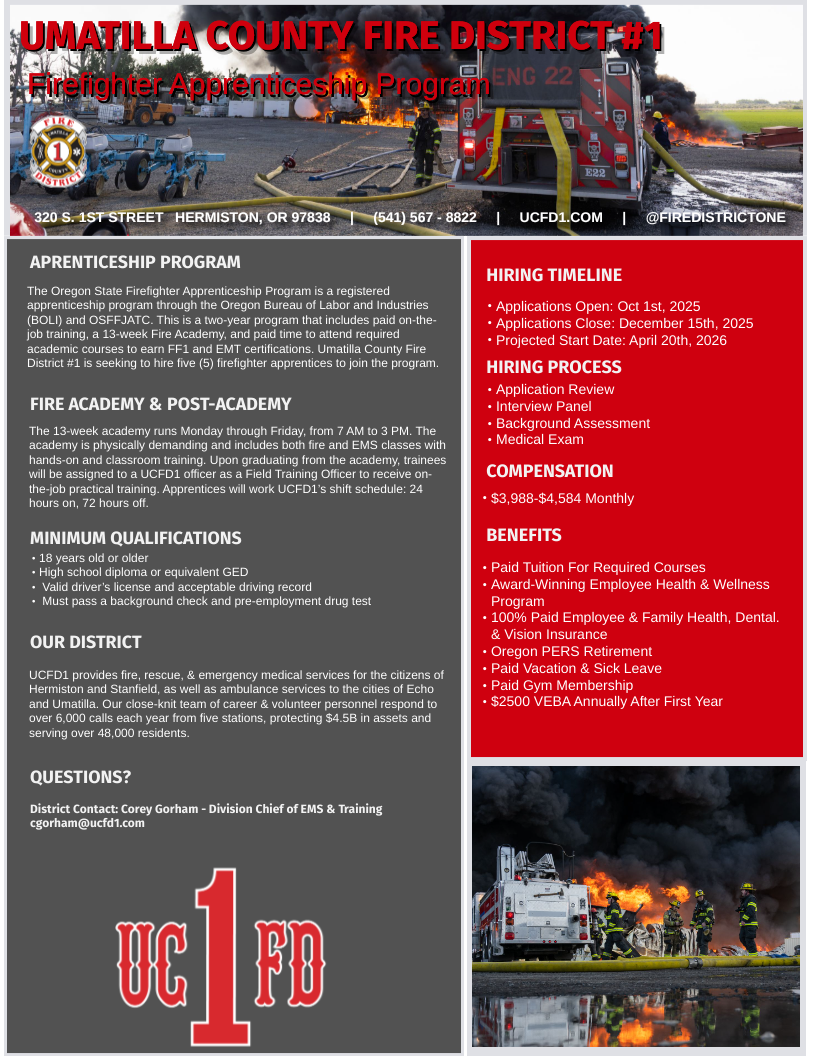 UCFD#1 responds to over 6,000 calls for service each year, providing emergency response to the cities of Hermiston, Stanfield, Echo, and Umatilla. The District serves over 48,000 residents across 4 cities and has an ambulatory service area of 620 square miles.